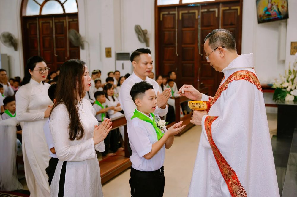 Niềm vui và hạnh phúc thiêng liêng nhất chính là giây phút các em cùng cha mẹ trang nghiêm tiến lên đón rước Chúa Giê-su Thánh Thể, một khởi đầu mới trong hành trình đức tin của các em.