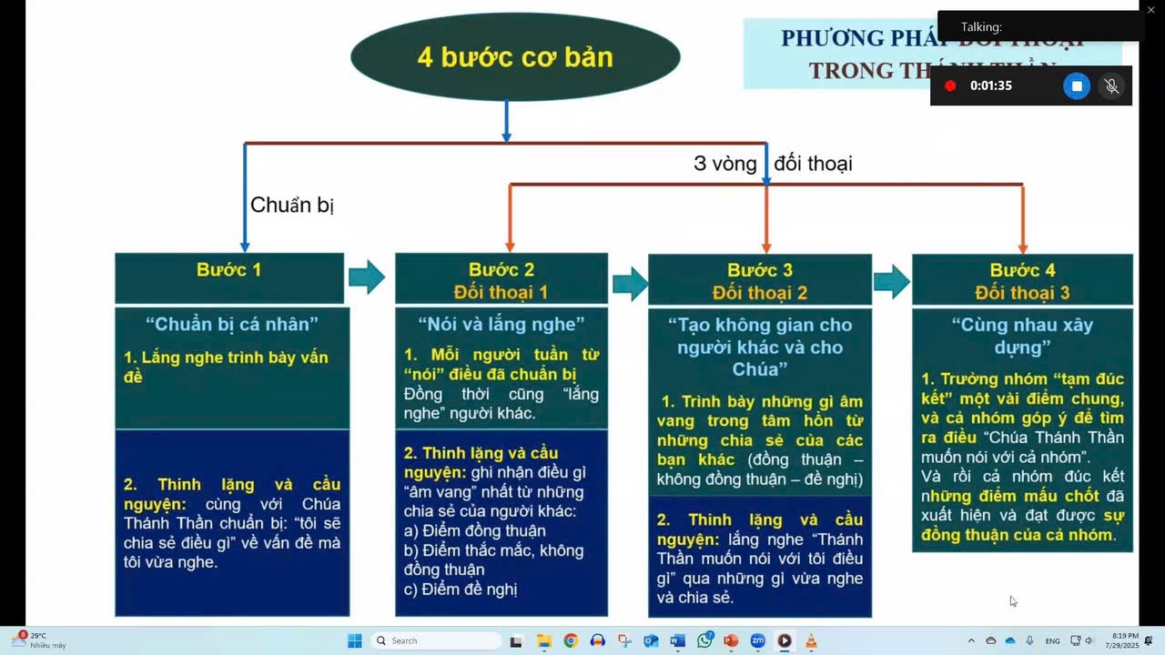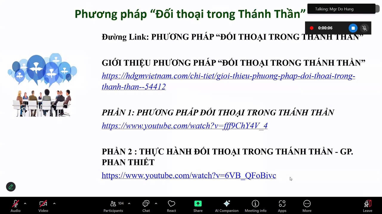 5. Áp dụng phương pháp “Đối thoại trong Thánh Thần”: Đây là cách giúp cộng đoàn thực hiện hiệp hành: lắng nghe – cầu nguyện – phân định chung dưới ánh sáng của Lời Chúa và Chúa Thánh Thần.