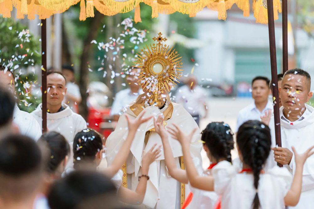Kết thúc Thánh lễ, Cha phó Giu-se đặt Mình Thánh Chúa để cộng đoàn tiếp tục dâng lên Chúa tâm tình tôn vinh Thánh Thể.