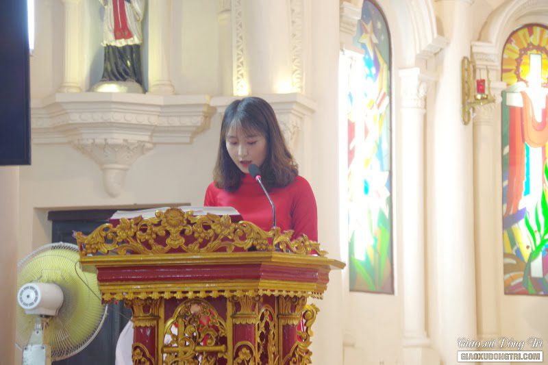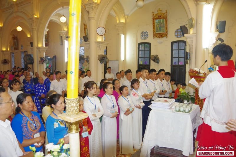 Đúng 17h30, Cha xứ đã tiến về cửa nhà thờ chào đón các anh chị em dự tòng, cùng với các anh chị và những người đỡ đầu tiến vào nhà thờ trong tiếng hát rộng ràng của bài ca nhập lễ. Mở đầu Thánh lễ, Cha xứ Antôn vui mừng chào đón 12 anh chị em dự tòng đã xin ra nhập Giáo hội Công giáo.