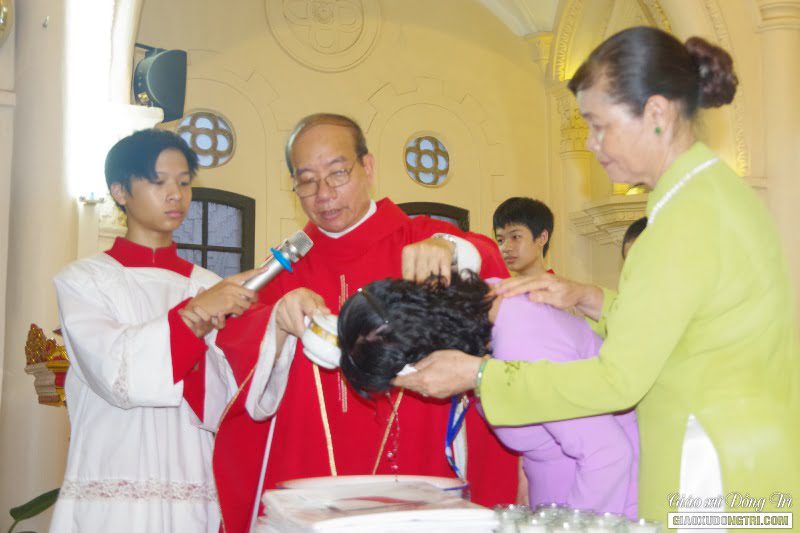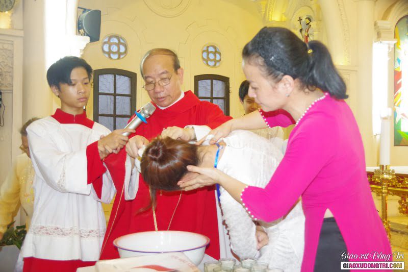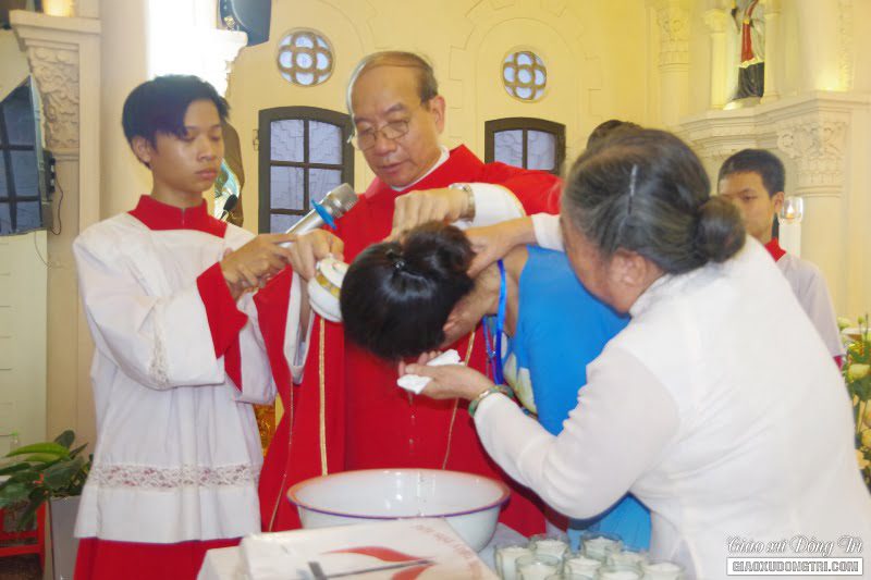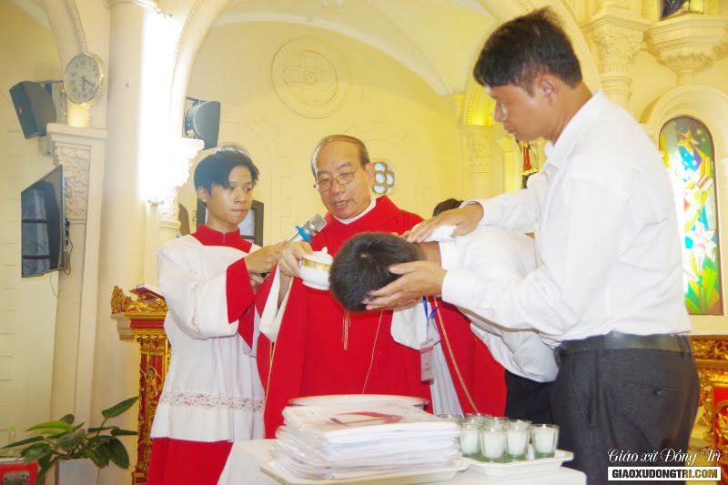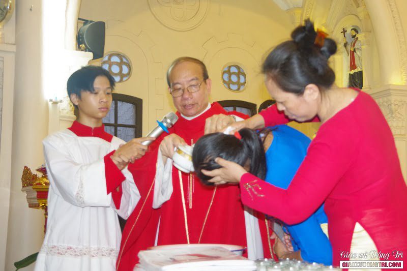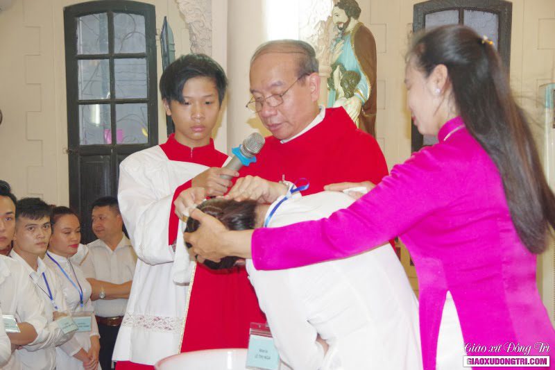 Sau bài giảng, Cha xứ đã ban các Bí tích Khai tâm cho các anh chị em dự tòng. Qua Bí tích Rửa tội, giờ đây các anh chị dự tòng đã trở nên con cái Chúa, con cái Giáo hội.