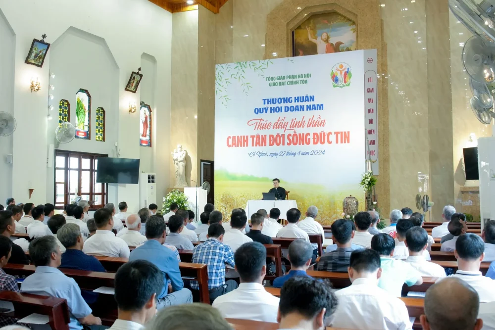Gần 400 tham dự viên đại diện các hội đoàn nam trong Giáo hạt Chính Tòa đã có buổi thường huấn với chủ đề “Thúc đẩy tinh thần canh tân đời sống đức tin” tại Giáo xứ Cổ Nhuế ngày 27/4/2024.