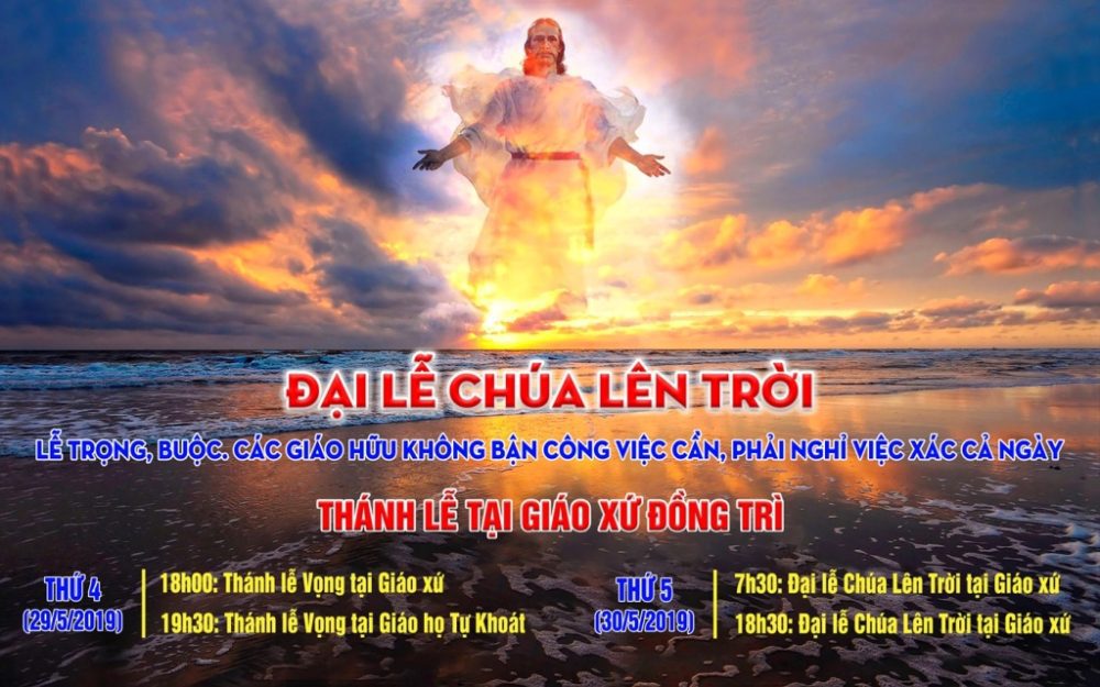 GIỜ THÁNH LỄ ĐẠI LỄ CHÚA LÊN TRỜI TẠI GIÁO XỨ ĐỒNG TRÌ * THỨ 4 (29/5/2019): - 18h00: Thánh lễ Vọng tại Nhà thờ Giáo xứ - 19h30: Thánh lễ Vọng tại Giáo họ Tự Khoát* THỨ 5 (30/5/2019): ĐẠI LỄ CHÚA LÊN TRỜI Lễ Trọng, Buộc. Các Giáo hữu không bận công việc cần, phải nghỉ việc xác cả ngày. - 7h30: Thánh lễ tại Nhà thờ Giáo xứ - 18h30:...