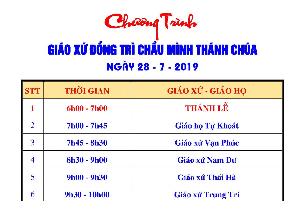 Chương trình ngày Chầu lượt tại Giáo xứ Đồng Trì (28/7/2019)