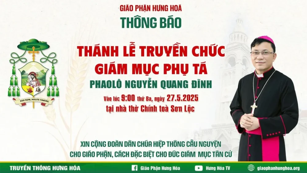 Trong niềm hân hoan vui mừng, Văn phòng Tòa Giám mục Hưng Hóa trân trọng thông báo: Thánh lễ Truyền chức Giám mục cho Đức cha Phụ tá tân cử Phao-lô Nguyễn Quang Đĩnh sẽ được cử hành lúc 09g00, thứ Ba, ngày 27/5/2025 tại Nhà thờ Chính Toà Sơn Lộc. Xin gửi tới quý......