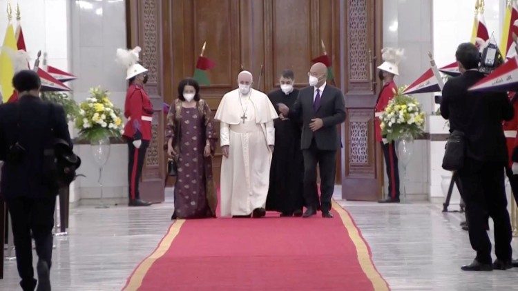 Sau khi hội đàm với Thủ tướng Iraq tại phi trường Baghdad, lúc khoảng 14:30 giờ ngày 5/3/2021, giờ địa phương, Đức Thánh Cha đi xe đến Dinh Tổng thống cách phi trường 21 km để gặp Tổng thống. Dù chính phủ Iraq đã chặn các con đường chính, nhưng dọc đường gần sân bay......