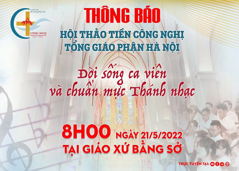 Ban Thư ký Công nghị Tổng Giáo Phận Hà Nội kính báo: Hội thảo tiền Công nghị về Thánh nhạc với chủ đề “Đời sống ca viên và chuẩn mực thánh nhạc” diễn ra tại giáo xứ Bằng Sở lúc 8h00 sáng thứ Bảy ngày 21/5/2022, sẽ được truyền hình trực tiếp trên website tonggiaophanhanoi.org cũng......
