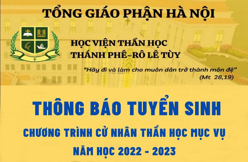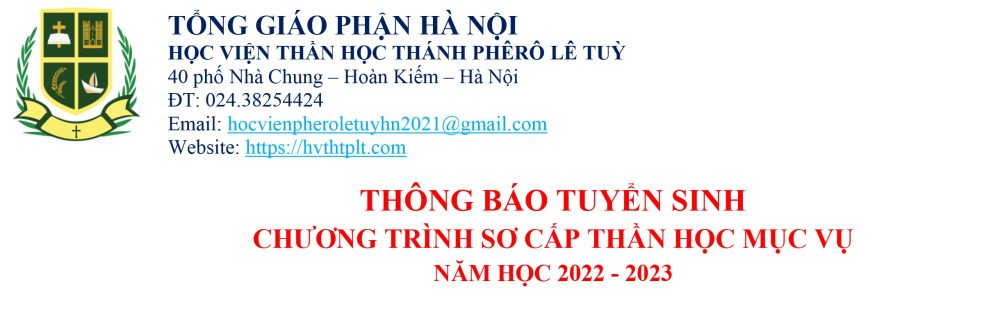 TỔNG GIÁO PHẬN HÀ NỘIHỌC VIỆN THẦN HỌC THÁNH PHÊRÔ LÊ TUỲ 40 phố Nhà Chung – Hoàn Kiếm – Hà NộiĐT: 024.38254424Email: hocvienpheroletuyhn2021@gmail.comWebsite: https://hvthtplt.com THÔNG BÁO TUYỂN SINH CHƯƠNG TRÌNH CỬ NHÂN THẦN HỌC MỤC VỤ NĂM HỌC 2022 – 2023 Thông báo tuyển sinh chương trình Sơ cấp Thần học Mục vụ năm......