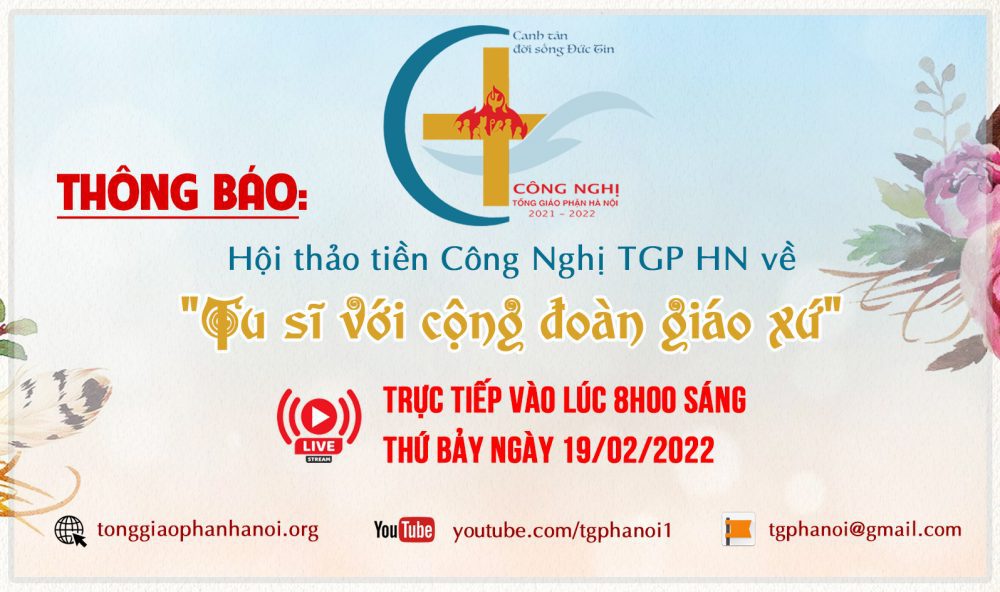 Ban Thư ký Công nghị Tổng Giáo Phận Hà Nội kính báo: Hội thảo về “Tu sĩ với cộng đoàn giáo xứ” sẽ được truyền hình trực tiếp vào lúc 8h00 sáng thứ Bảy ngày 19/02/2022 trên website tonggiaophanhanoi.org và trên các nền tảng khác như Youtube cũng như Facebook. https://youtu.be/002TCxfrqVk https://fb.me/e/eYMe5XZAv Anh chị em......