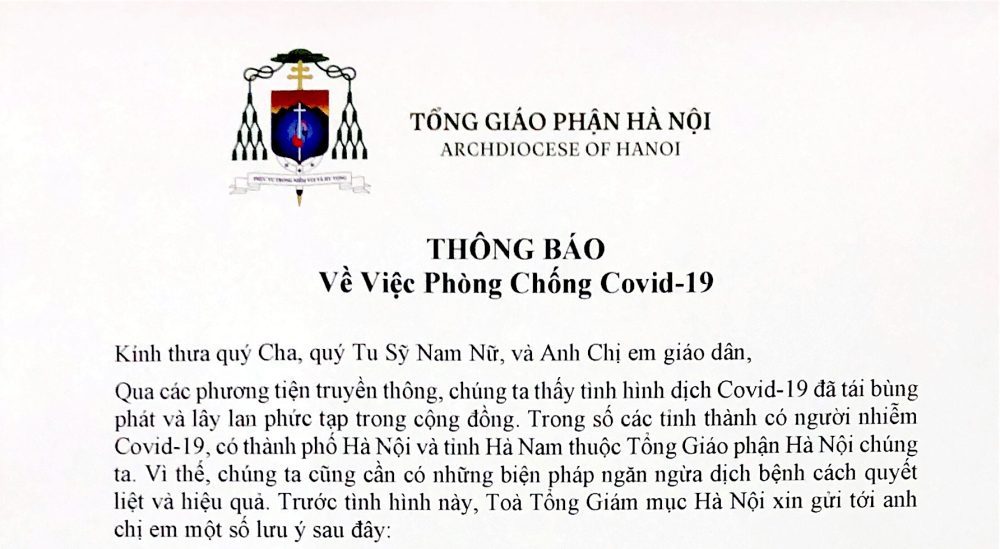 Kính thưa quý Cha, quý Tu Sỹ Nam Nữ, và Anh Chị em giáo dân, Qua các phương tiện truyền thông, chúng ta thấy tình hình dịch Covid-19 đã tái bùng phát và lây lan phức tạp trong cộng đồng. Trong số các tỉnh thành có người nhiễm Covid-19, có thành phố Hà Nội và......